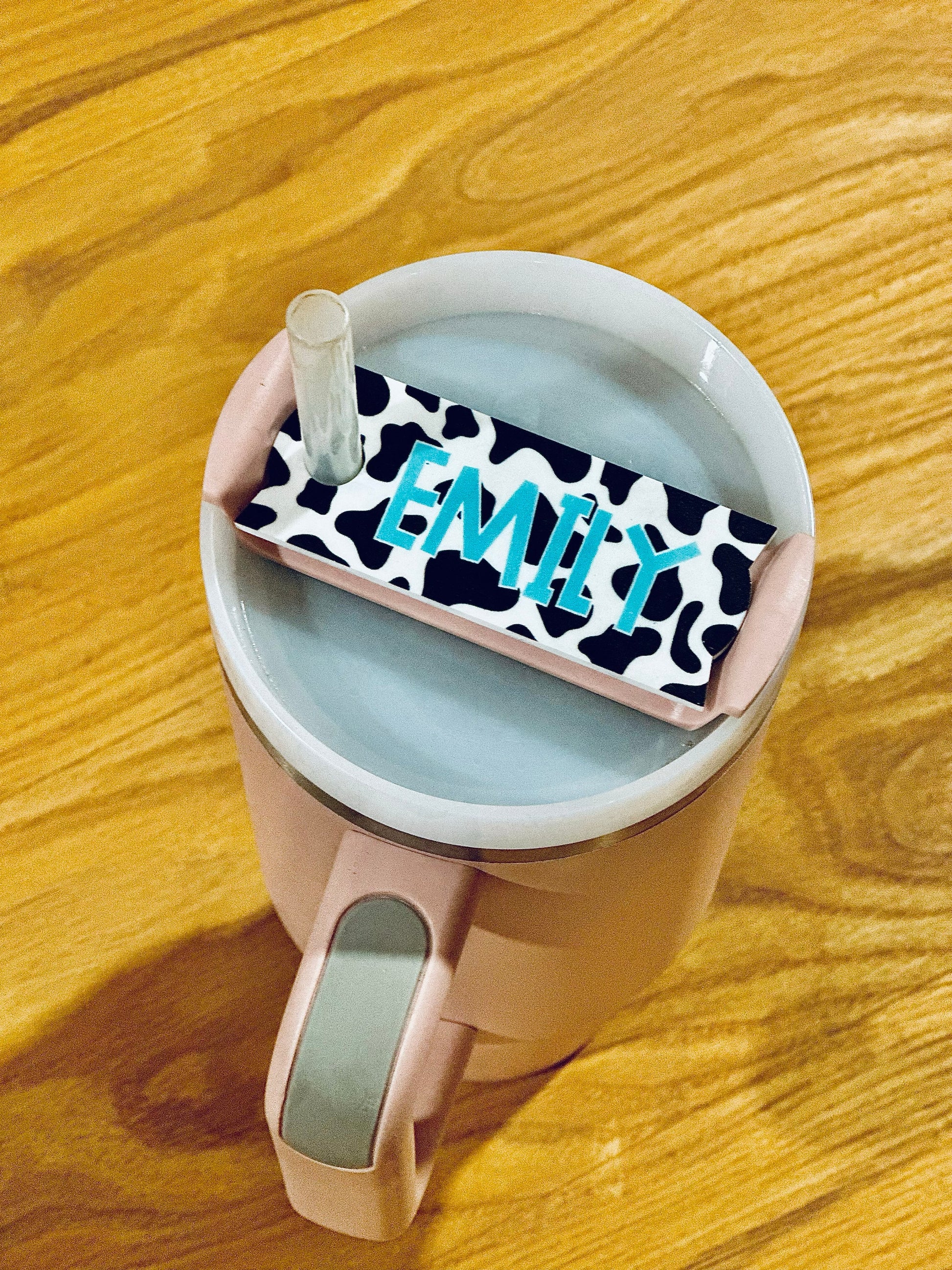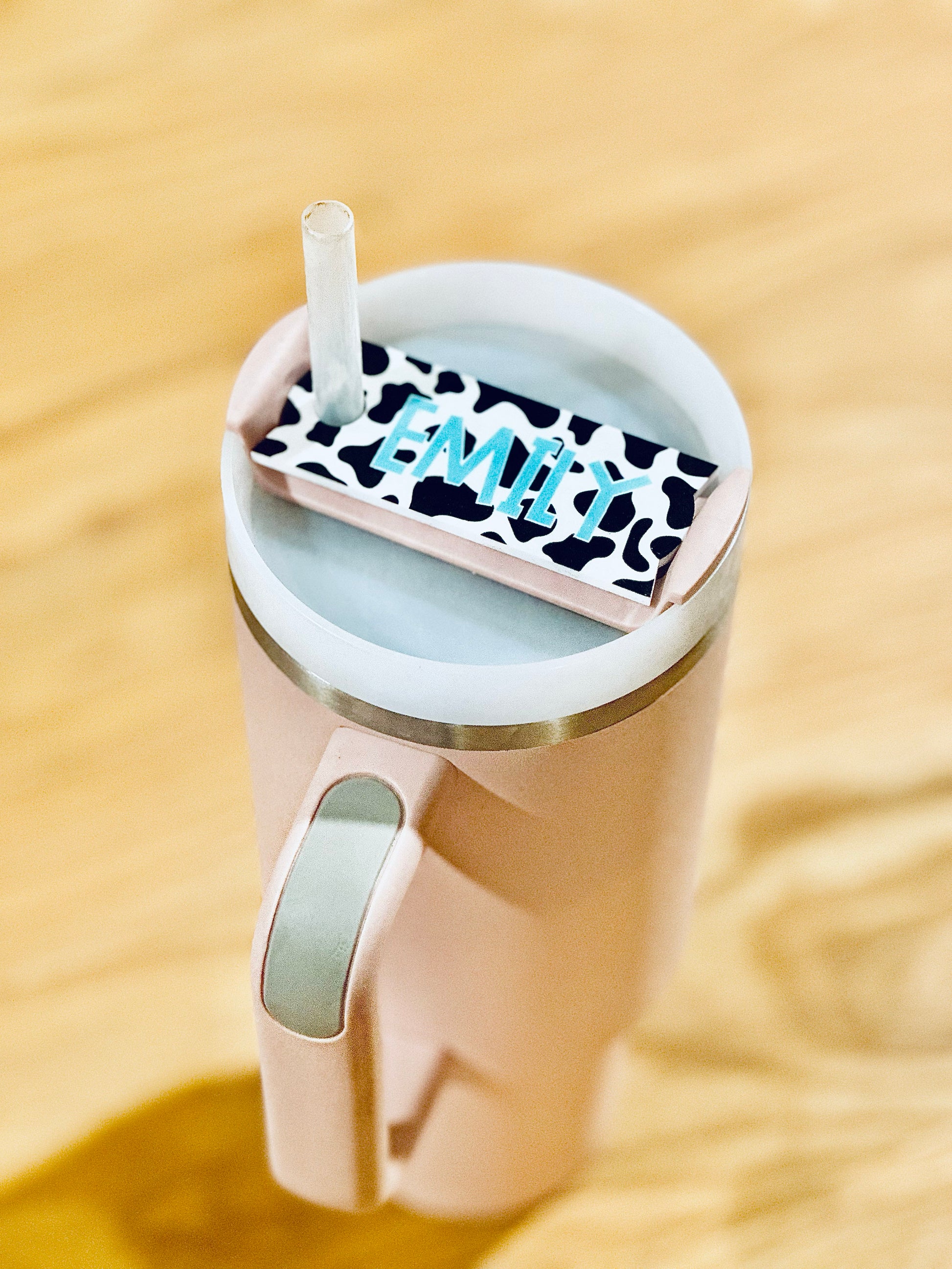 Custom Cow Print Pencil Stanley Quencher V2 Tumbler Lid Name Tag 20/30oz or 40 oz insulated Name Topper Personalized Acrylic mug Rectangle